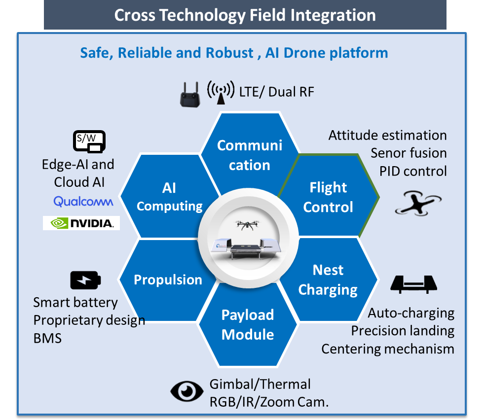 Our RD keep focusing on flight control, sophisticated AI computing, reliable RF communication for real time judgement, propulsion, sensor fusion , and further develop technology for gimbal camera, and GCS.