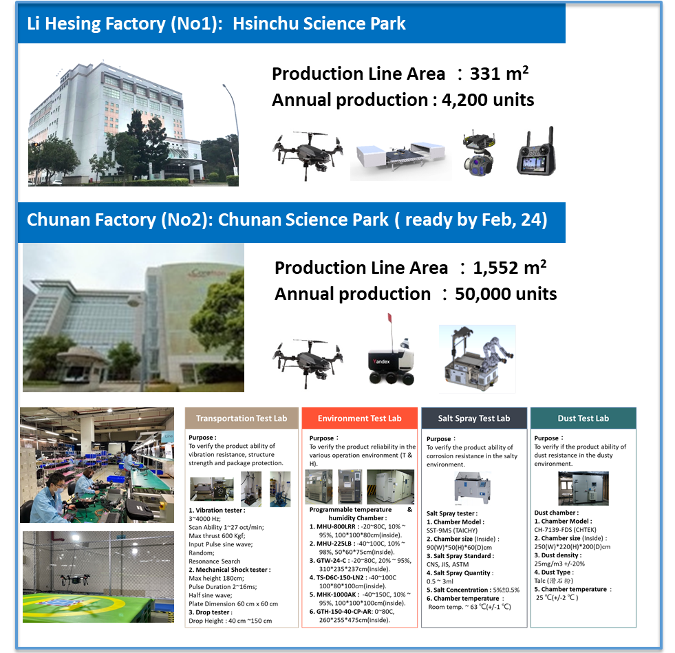 CiRC is the 1st profectional drone manufacturer in Taiwan which is qualified vendor of ODM customer in the United State. Both of the two manufacturing sites produces drone, gimbal camera, ground control system, and AMR. Total production capacity of the two sites: 54,200 units.